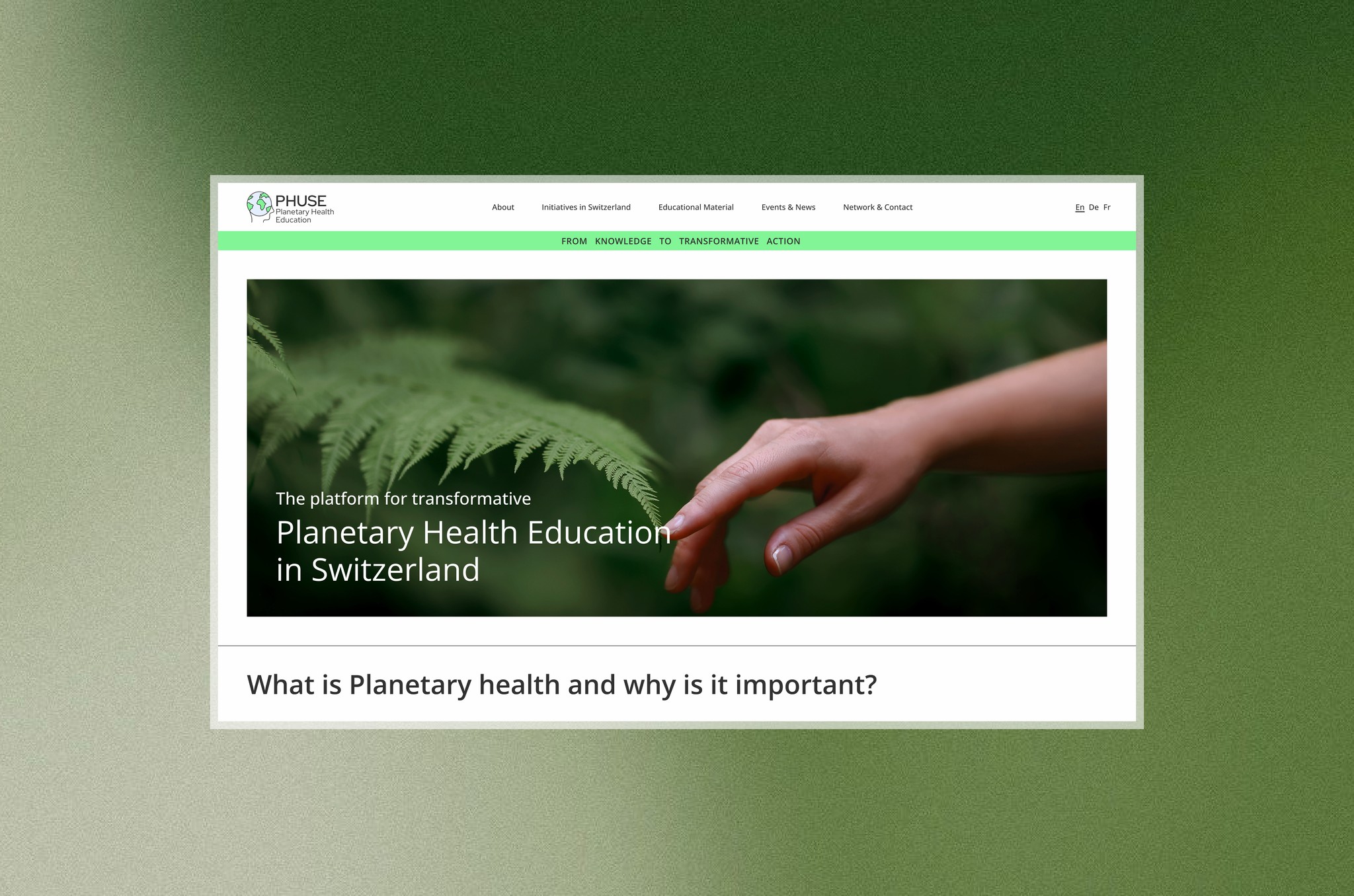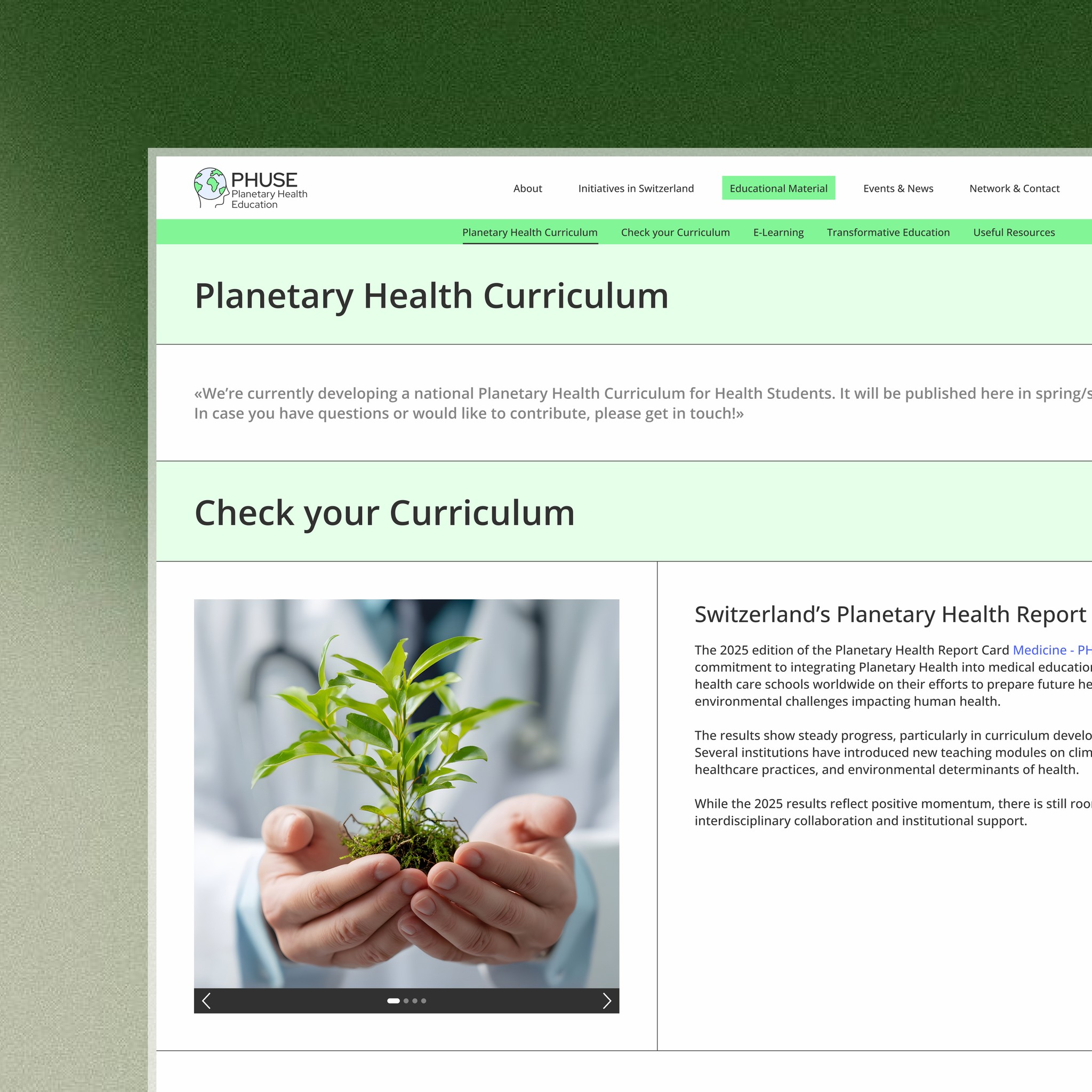 PHUSE is a national initiative funded by swissuniversities that works to integrate Planetary Health into health-related study programs across Switzerland.