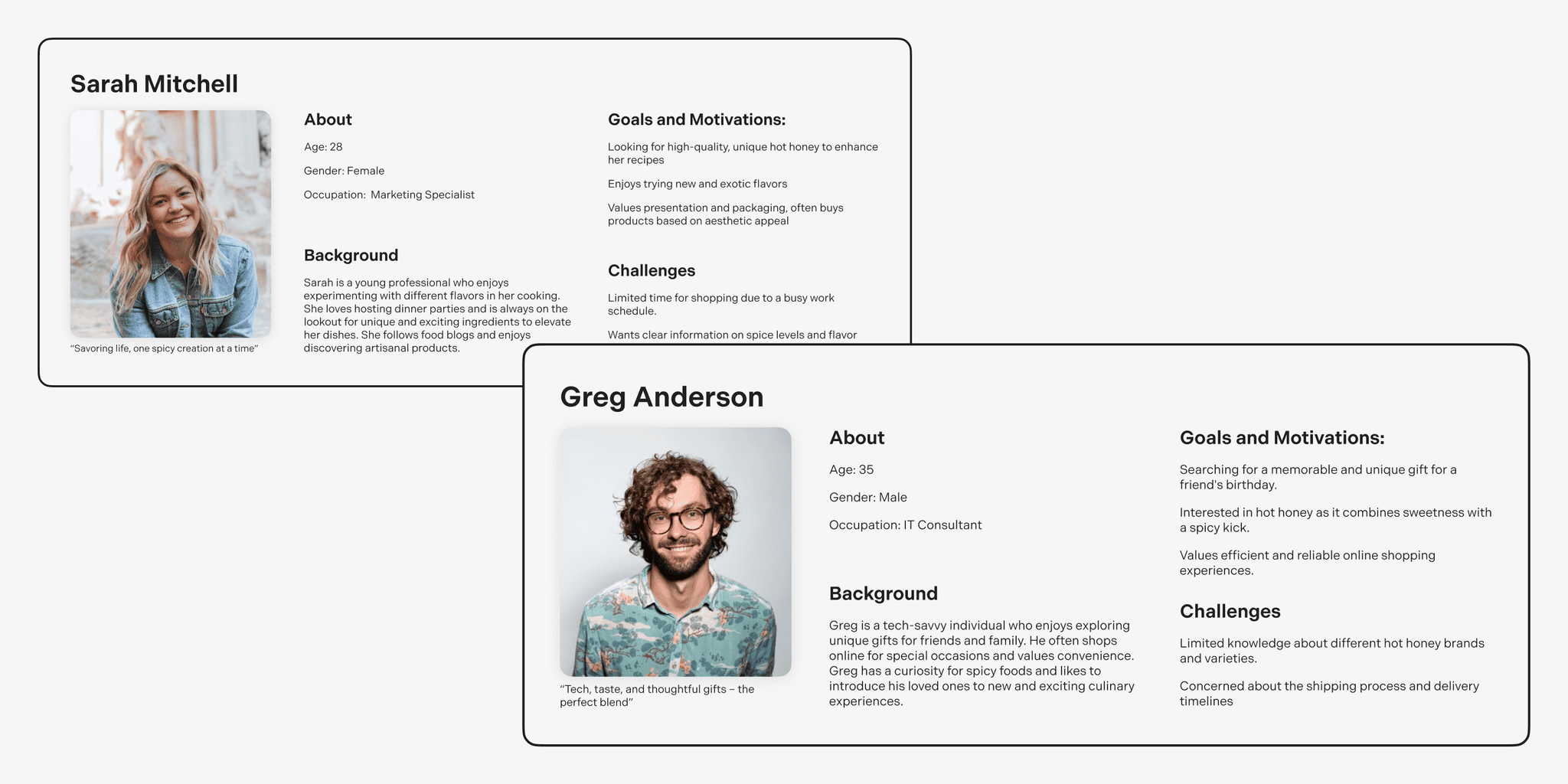 Based on research into target customers, these personas were crafted to guide product and marketing strategies. By defining goals, motivations, and challenges, Sarah and Greg represent key segments interested in Spring’s Hot Honey and its unique culinary appeal.