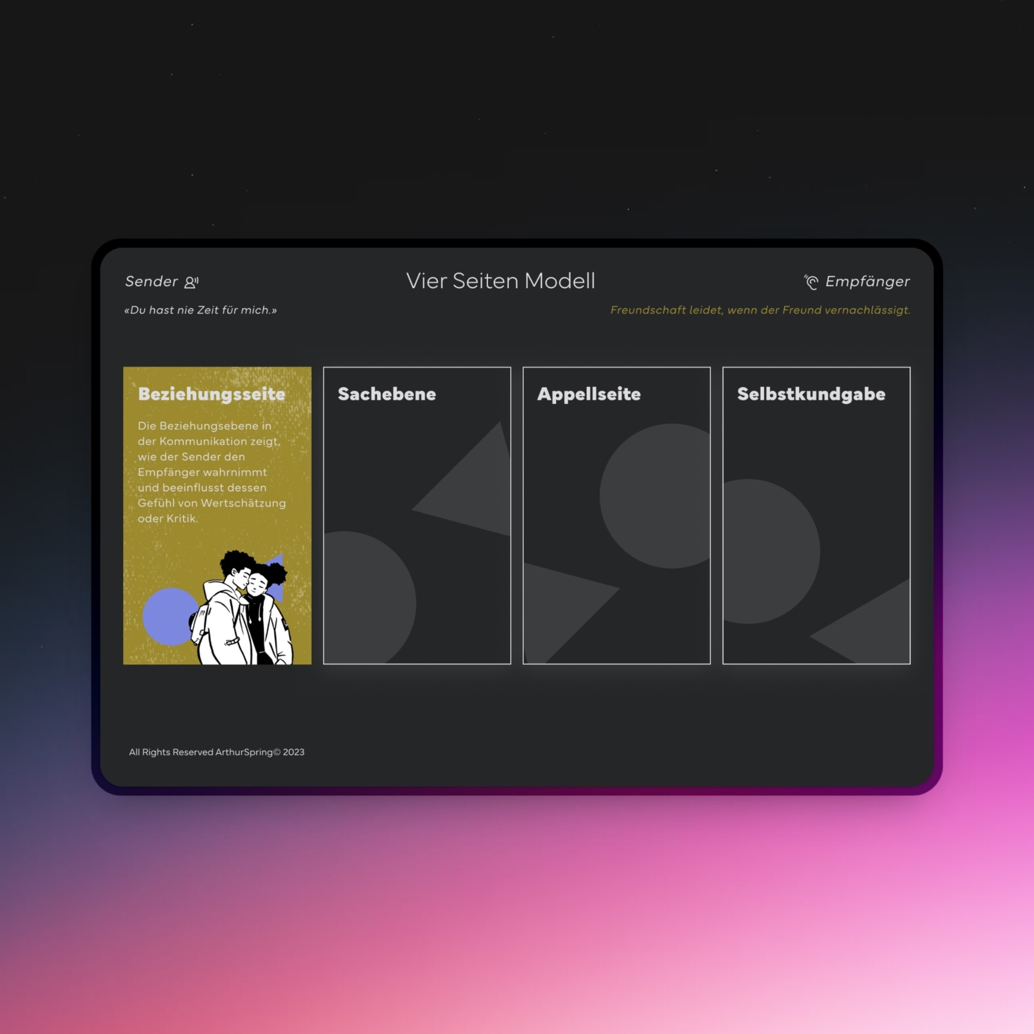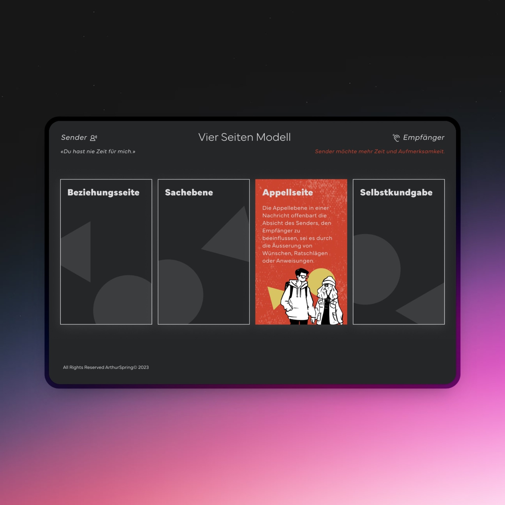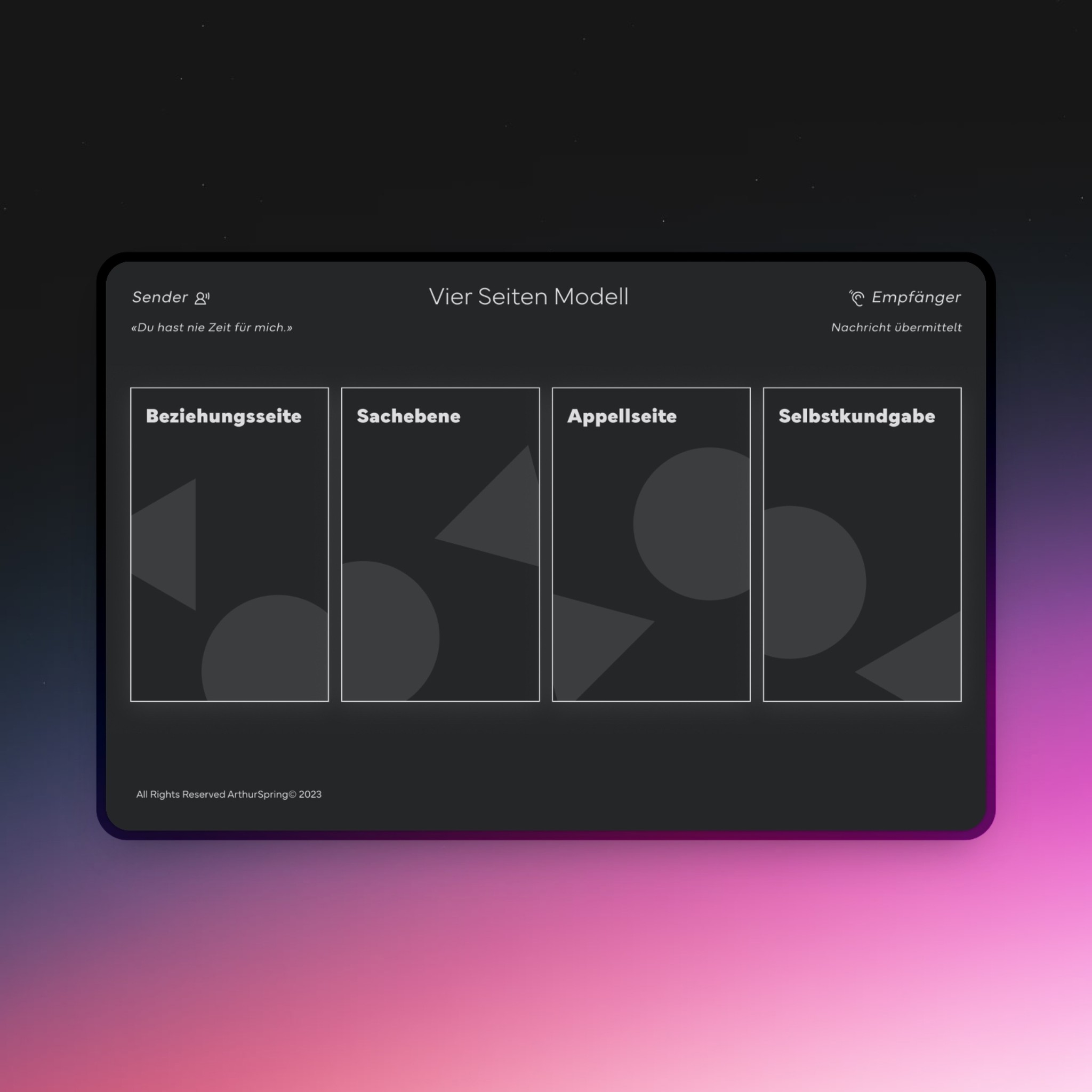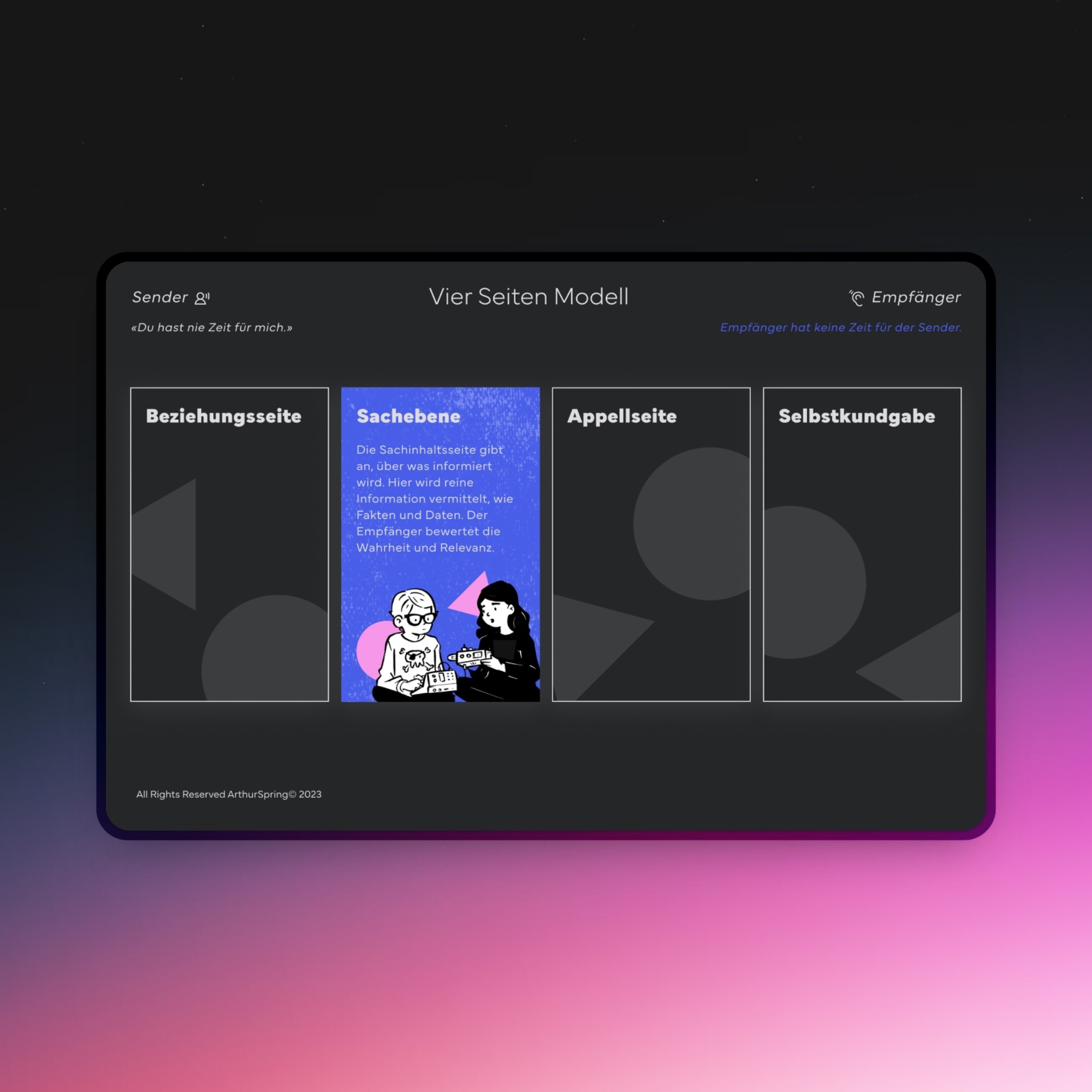 “Vier Seiten Modell” (Four-Sides Model) was a small prototype I created during my time at GBS to explain the four communication sides through an interactive, easy-to-use example. We were free to try anything we wanted, so my first idea was to experiment with something I was just getting to know: the hover effect in Figma.