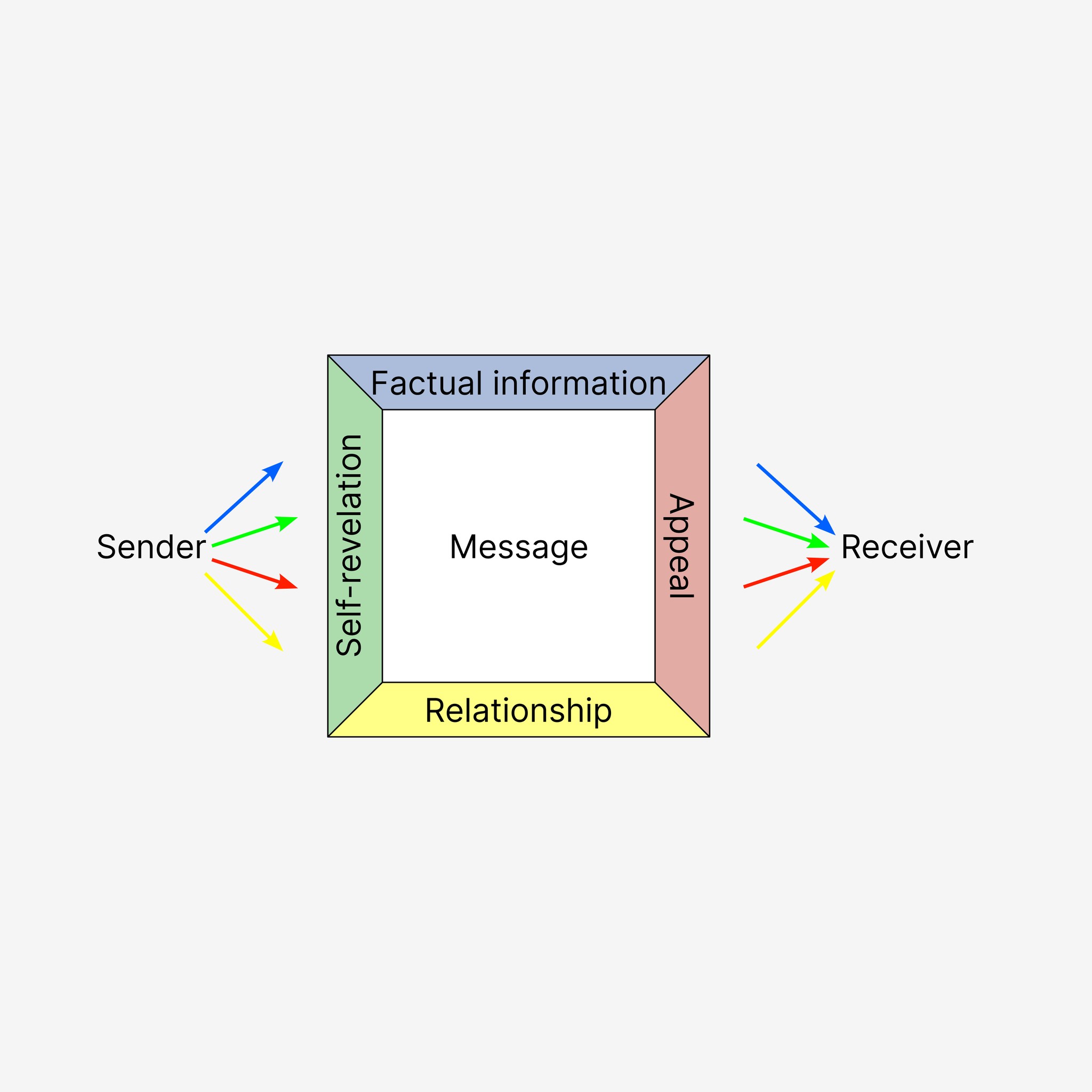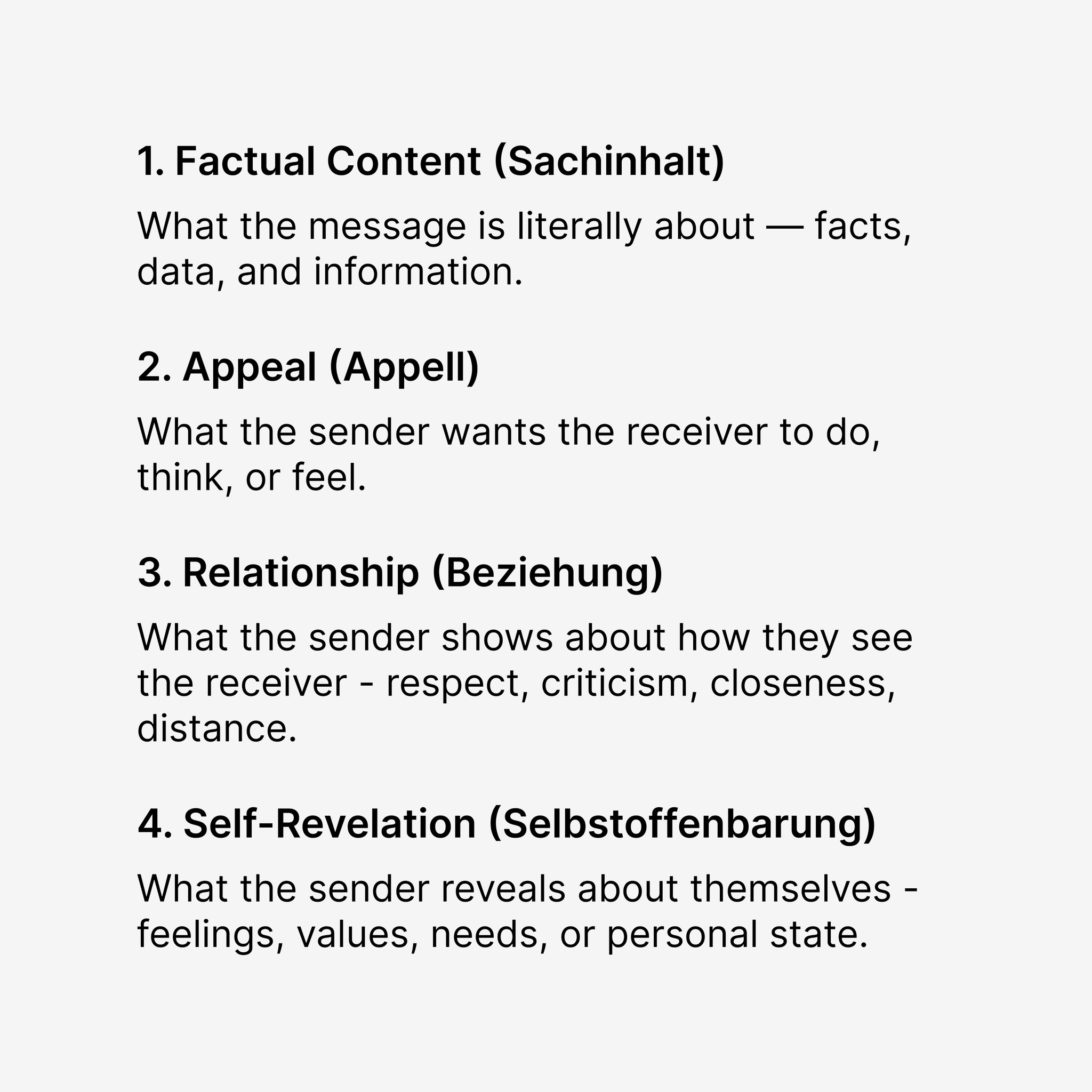 The Four-Sides Model explains that every message carries four layers at once: the factual information, what the speaker reveals about themselves, how they feel about the other person, and what they want to achieve or trigger with the message. It shows that communication is never just about words, but also about relationships, intentions, and self-expression.